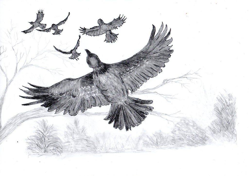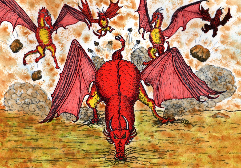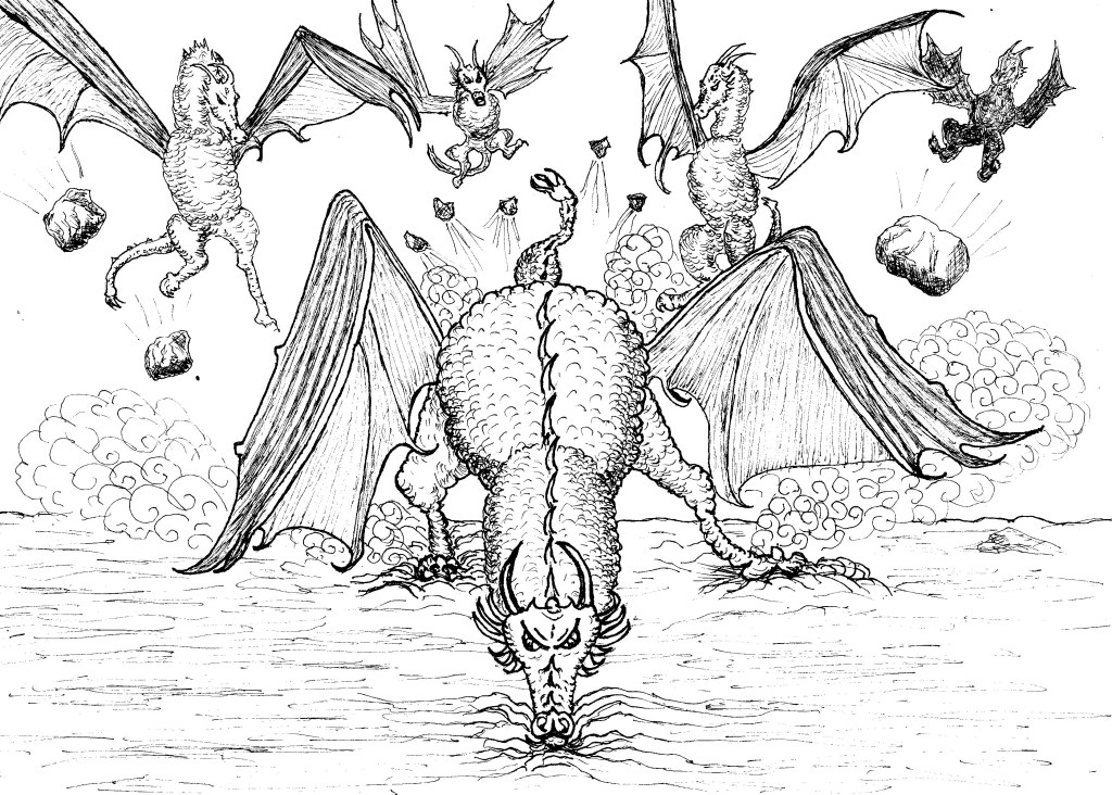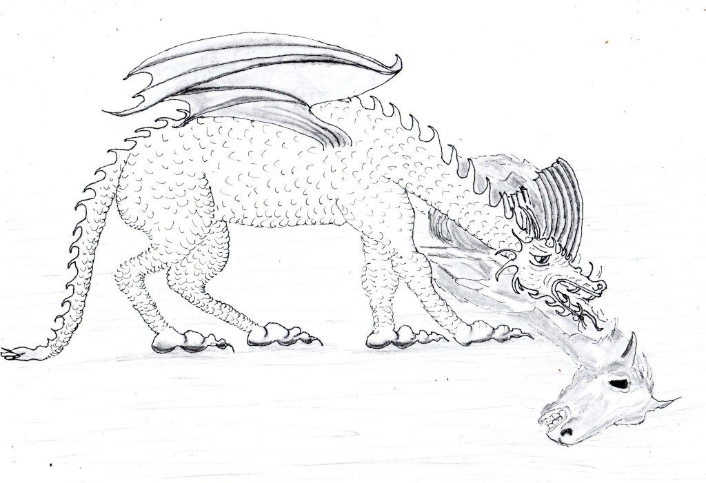 “Grimes strung the bow and charged it with an arrow, took aim and fired. The arrow missed its target disappearing in the ether. Grimes quickly loosed another to no avail. The young dragon saw Grimes and spied a third arrow speeding its way towards him. With a tip of his great wings, his flight dipped and the arrow flew past.”