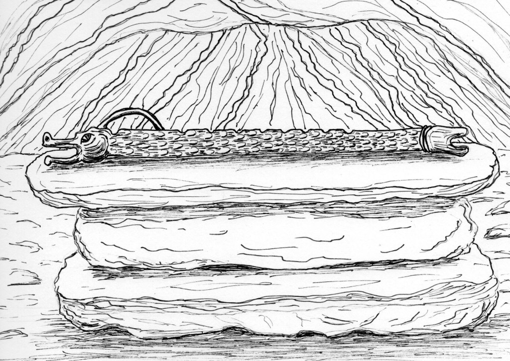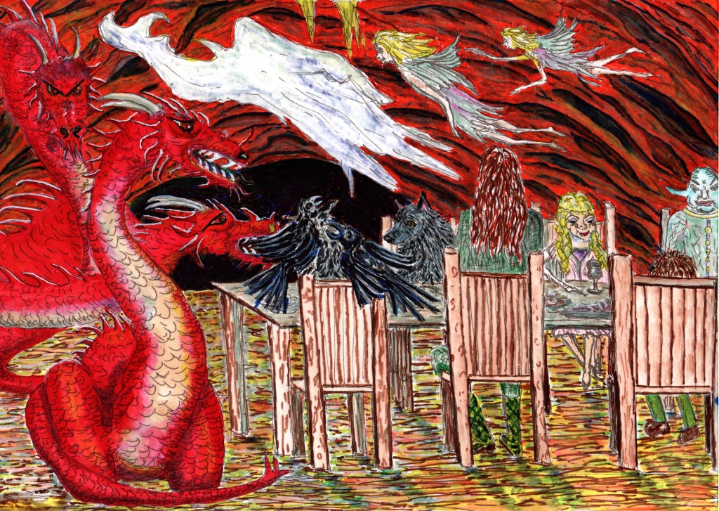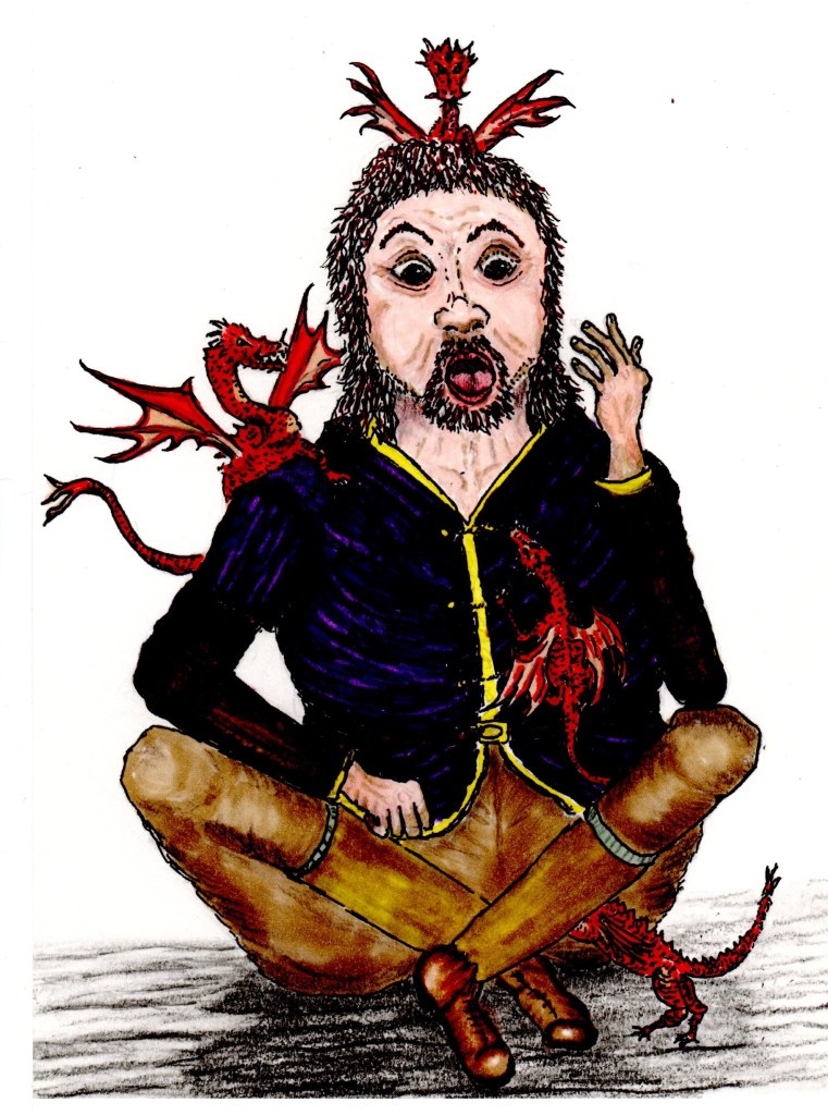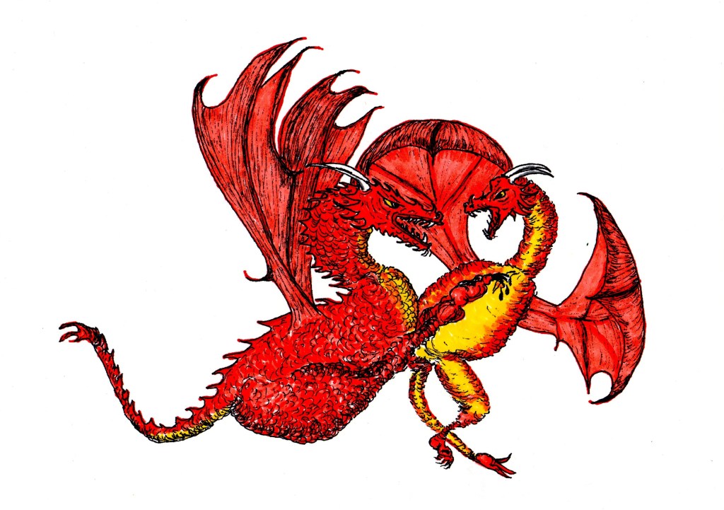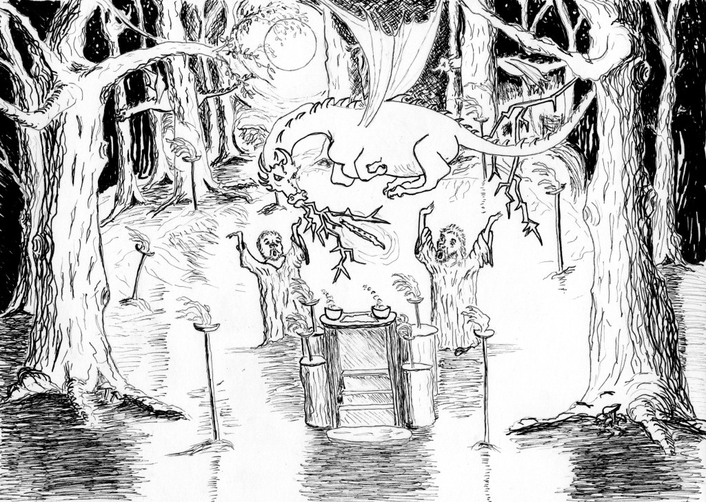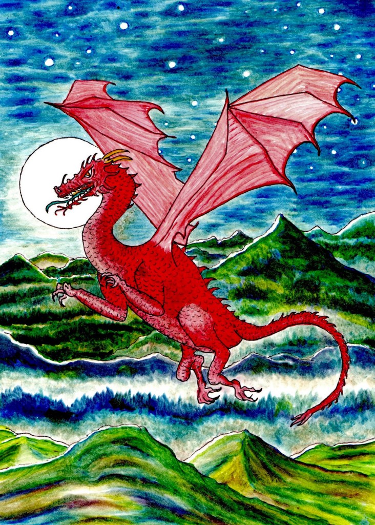 Around the hollow beyond the trees, a swirling wind blew in never ending circles around us, over and over, round and round. It gave the sense of being in the centre of a whirlwind but we were safe in the core, protected by the magic of the circle. Another bolt of blue lightning silently struck the earth, it seemed to emanate from the moon but I failed to see how this was possible. Within the whirlwind spirits of dragons long dead flew round and round the hollow, exhaling fire towards the Alter but we are protected, so the flame simply failed to find a target and disappeared into the ether. Round and round they circled, on and on. Lightning struck again and again, each time making our beings tingle from head to foot. Without warning a spirit dragon framed by the full moon, golden in splendour hovering above the hollow appeared from the ether. Large eyes peered down, their iris like saucers and with flared nostrils the dragon exhaled. Slender flashes of blue, purple and red lightning zig zagged downwards illuminating ‘ffliwt y ddraig’ set in the centre of the Alter. The dragon flute rose into the air vibrating and began to spin, faster and faster. It seemed as if the flute spun as fast as the spirit dragons flew endlessly round the hollow. Lightning struck the hollow and again the dragon exhaled, and the flute spun round and round. The whirlwind slowed, the spirit dragons ceased exhaling flame and the dragon above us exhaled once more. ‘Ffliwt y ddraig’ slowed its spin within the zig zagging lightning and fell silently to the Alter. Whirlwind, dragons and lightning disappeared almost as quickly as they appeared, and suddenly we stood alone, torches fading within the hollow. We two dwarves looked to each other and smiled, the ceremony was over, ‘ffliwt y ddraig’ now a living breathing magical flute, capable of summoning dragons.