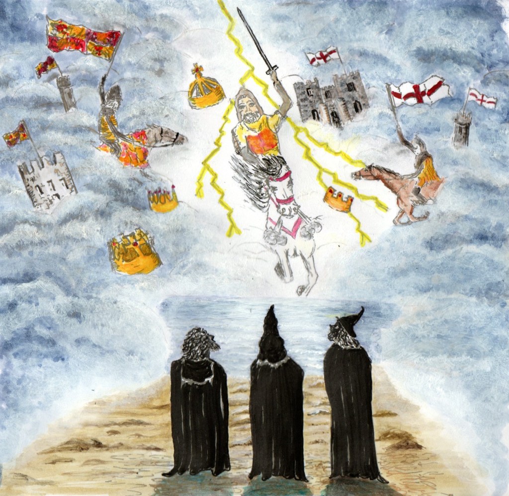 “Being so warm for a change laying on my comfortable cot snuggled under sheepskins, it was not long before deep sleep opened yet another dreamscape. I saw vague images all around me, fading in and out of view. I was standing on a crag, a precipice of rock high in the mountains, my eyes seeking clarity towards valleys way off in the distance. In no time at all my vantage point flew closer to the valley and I seemingly hovered above a never-ending procession of soldiers wearing emblems and sporting banners of the English. As I looked down upon the scene below me, mounted heavily armed knights and infantry with pikes and longbows, line after line of them marching ever onwards in clouds of dust. My mind intuited a retinue of over two thousand men. This was a force to be reckoned with, but their progress appeared slowed by unfriendly terrain and frequent heavy downpours. I couldn’t help thinking their slow pace was a good thing. It was clear I was dreaming and seeing the approaching invaders discussed earlier with Owain. But who is leading them, who is in charge? That I did not know. My senses shifted and suddenly I was aware of hovering over Pilleth. I recognised the rolling hills and the church but away to my right Bryn Glas stood green and majestic with woods and forest rising up the sides of the valley. Suddenly my intuition exploded in colourful visions of our men with longbows stood at the top of the hill and secreted in the woods lining the valley. The visions faded and suddenly I awoke, back in my cot. Reaching across to the table at the side of my bed and grabbing a sheet of parchment, filling my quill I quickly wrote down the details of the dream. This dream was definitely prophetic in nature and Owain must be informed. Could this be the strategy we needed to defeat the English? ”