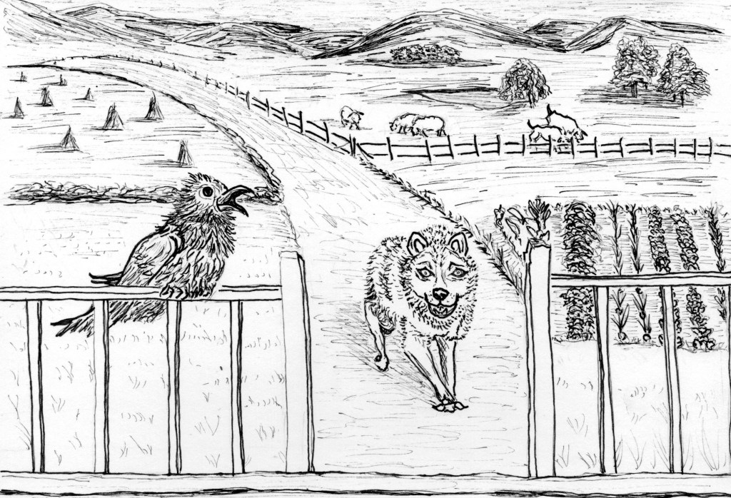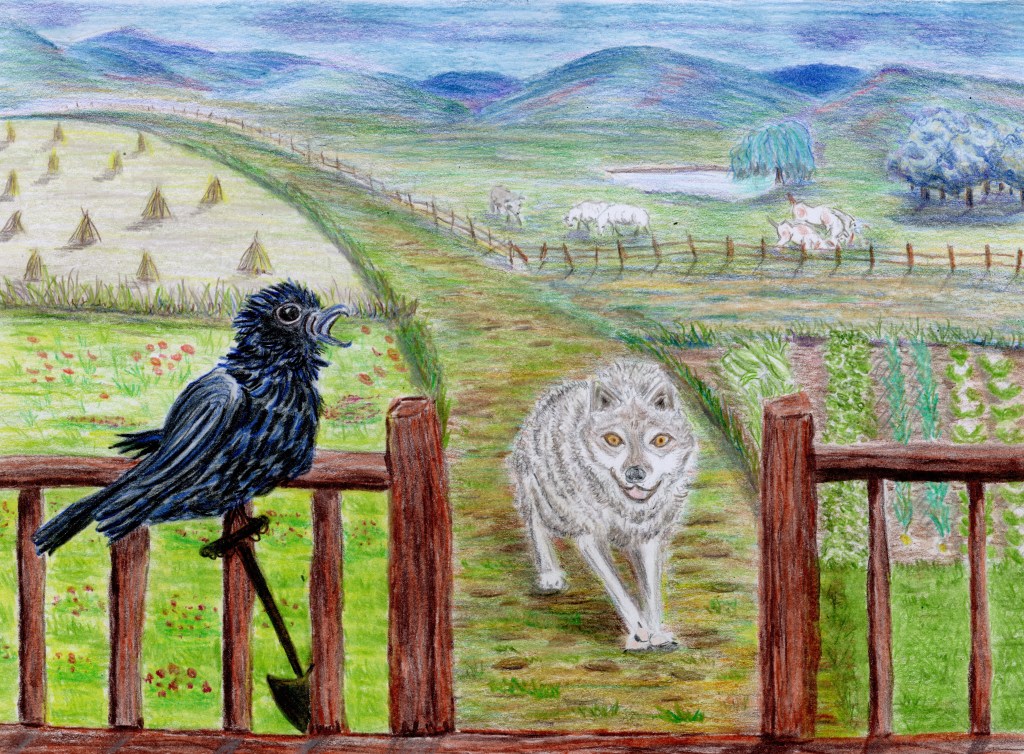 “Caron returned squawking and landed on the veranda at dusk. Half an hour later Wolf gambolled towards the cottage, yipping and barking.”