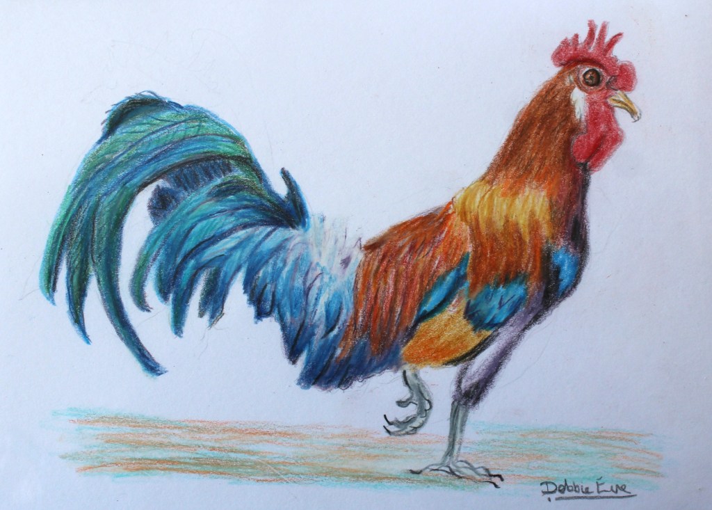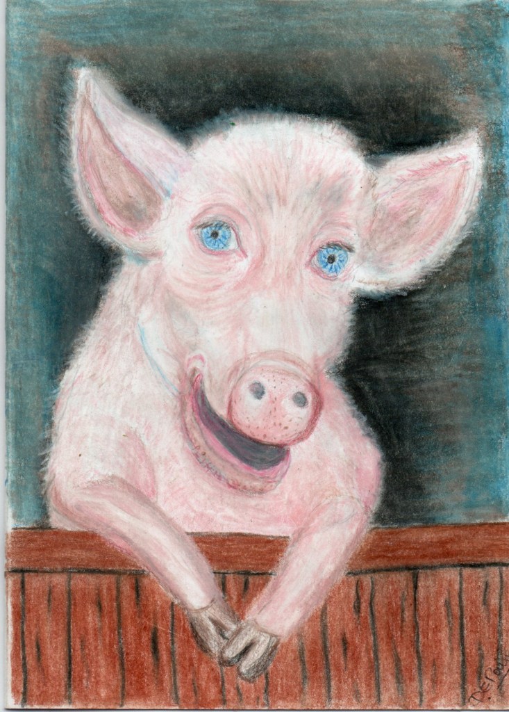 This comical chatty pig is an original signed card, with no prints made so is totally unique. I have used oil based coloured pencils and have sprayed the card with fixative. It is blank inside for your own message and comes with an envelope.
