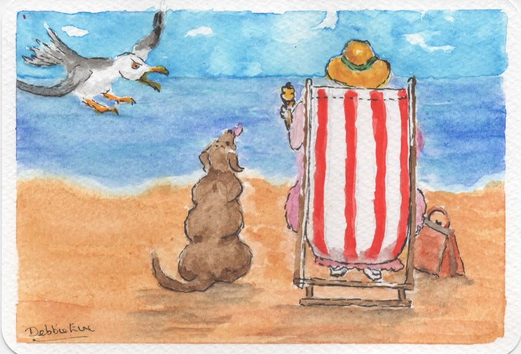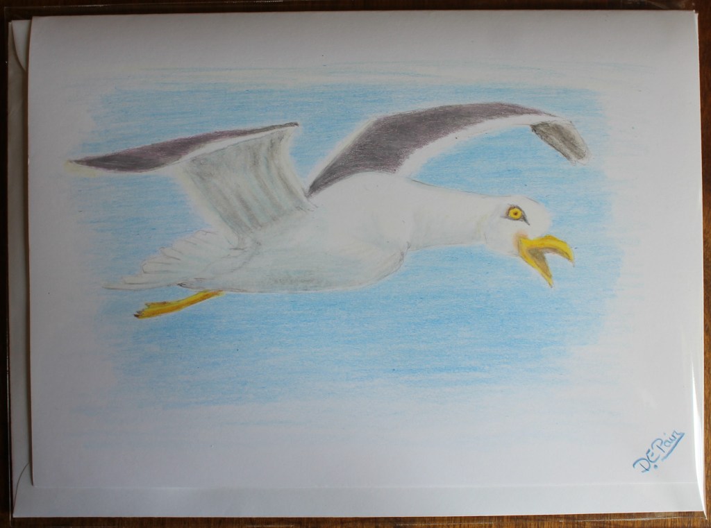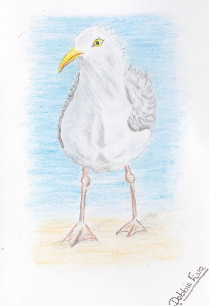 A few years ago I met a seagull who joined us for the day when we were on holiday on the West Coast of Wales, UK. He was comical bird who kept us amused for hours and we named him Cecil. I drew this coloured pencil card in memory of this wonderful gull.